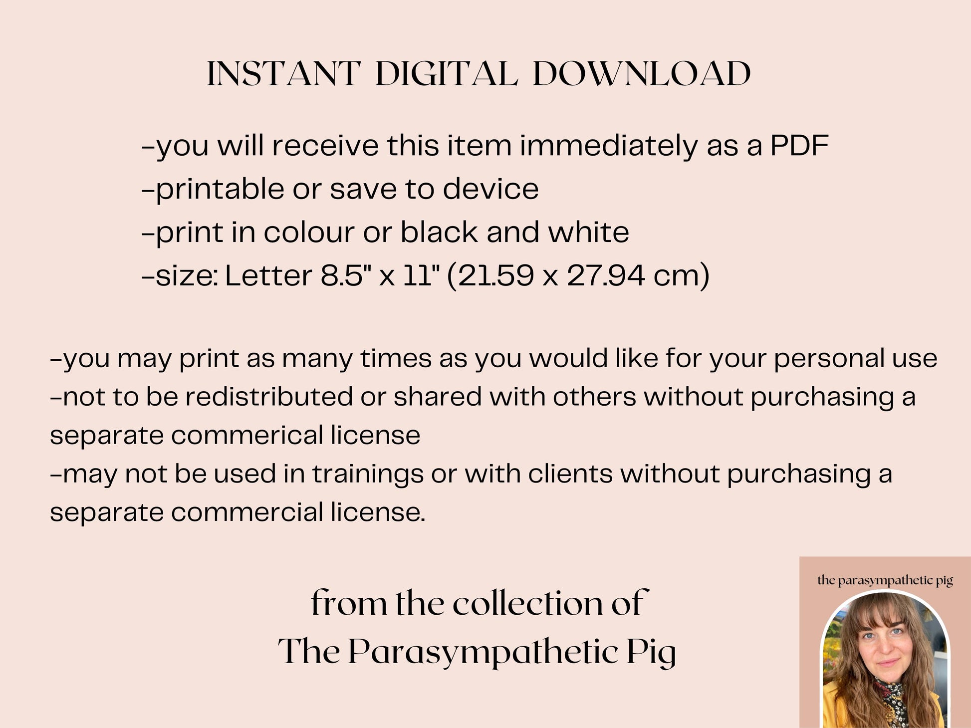 Limited Use: This product is a digital download for personal use only. Sharing, redistribution or professional use without proper licensing is not permitted. Need to use this with clients or groups? Purchase a COMMERCIAL LICENSE separately: https://alannacarlson.ca/products/commercial-license-resources-digital-download-for-therapist-wellness-coach-for-client-care-materials-for-session-treatment-pdf-digital